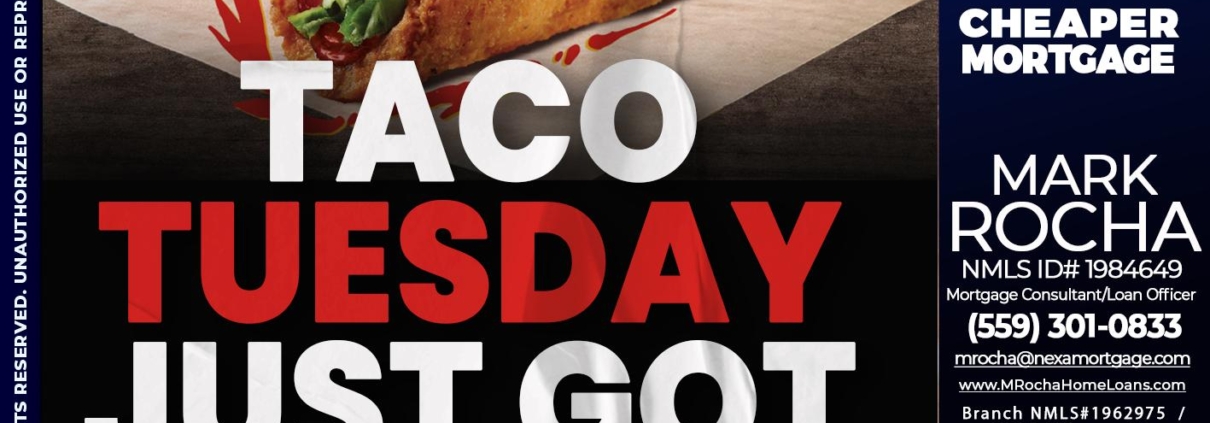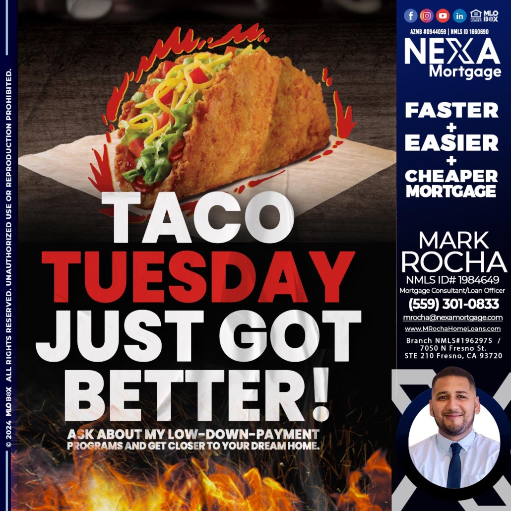TACO TUESDAY - Mark Anthony Rocha -Loan OfficerHi, my name is Mark Anthony Rocha. I’m a Loan Officer with NEXA Mortgage LLC., offering personalized mortgage solutions, fast customized quotes, great rates and service with integrity.